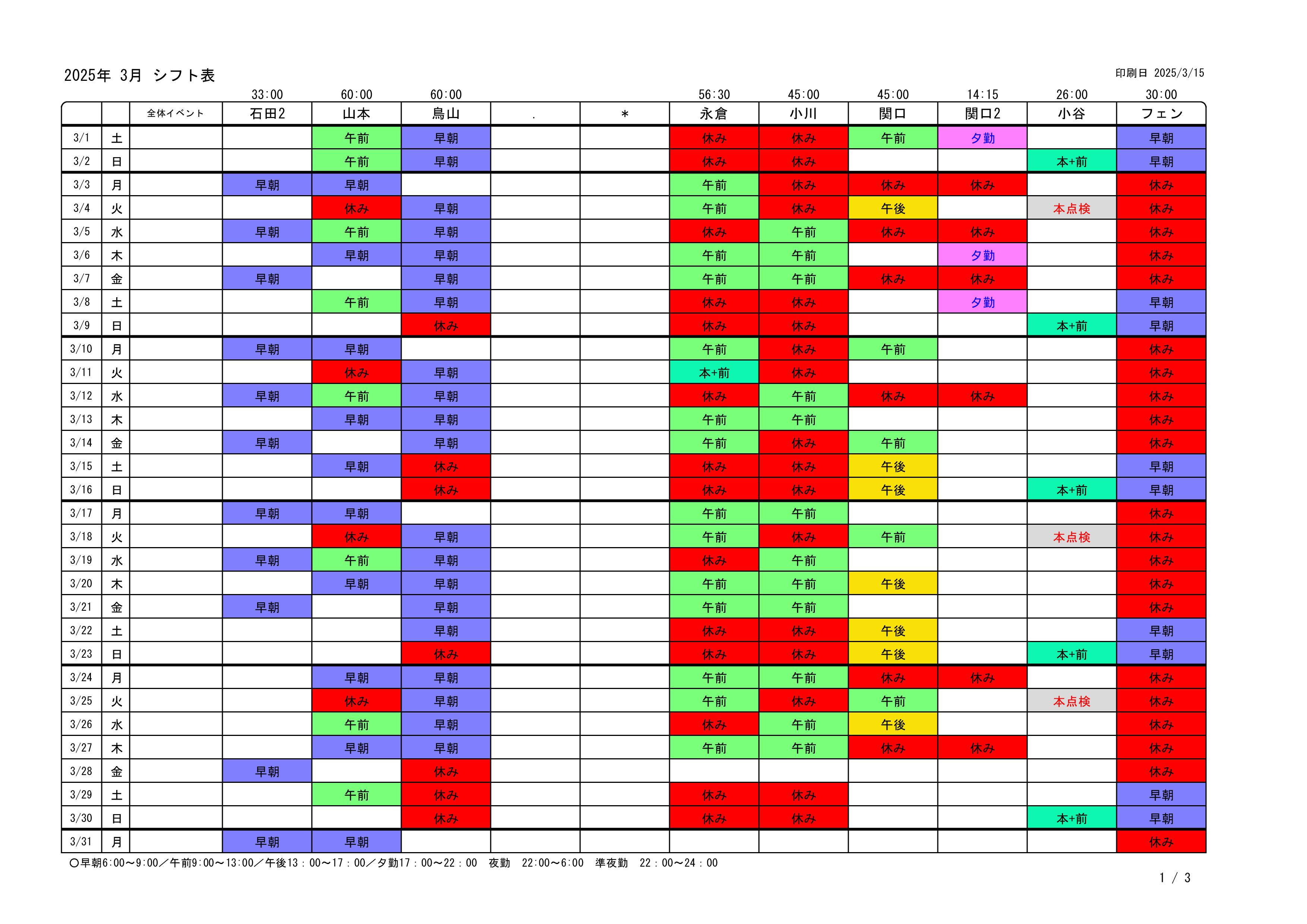 | 各シフト時間帯で全員が同時に休みという事態は相談しあって避けて下さい。 |